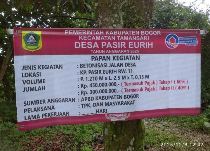 BOGOR BARAT??? ???Pembangunan infrastruktur betonisasi Jalan Desa Pasir Eurih, Kecamatan Tamansari, Kabupaten Bogor yang bersumber dari anggaran Bantuan Keuangan (Bankeu)Tahap I dan Tahap II terus berjalan dan dipastikan sesuai dengan Rencana Anggaran Biaya (RAB) serta ketentuan teknis yang telah ditetapkan, pada Jumat, 14/12/2025.